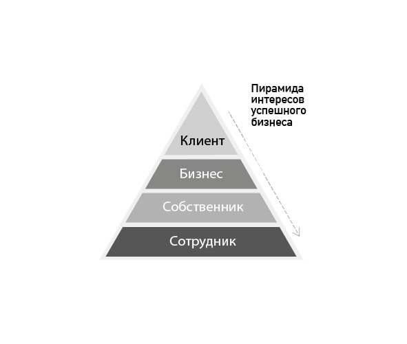 На третьем месте – интересы собственника. Собственник всегда действует в интересах клиента, потом в интересах бизнеса и его развития и затем – в своих интересах.