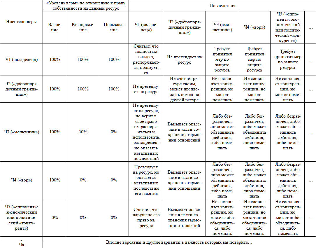 Для каждого конкретного случая, в каждую конкретную эпоху, в каждой отдельной стране, каждый отдельный человек может в этот инструмент верить или нет. Соглашаться с правом собственности на тот или иной ресурс или нет.