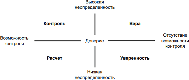 Веру мы привыкли оценивать как «слабую» и «сильную»[35]. Однако она всегда «включается» в наши действия при высокой неопределенности и отсутствии возможности контроля. Доверие (того или иного уровня) имеет место и в этом, и во всех остальных случаях.