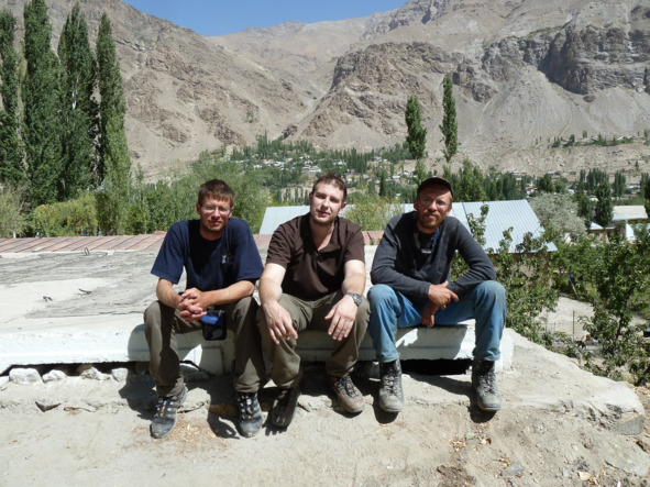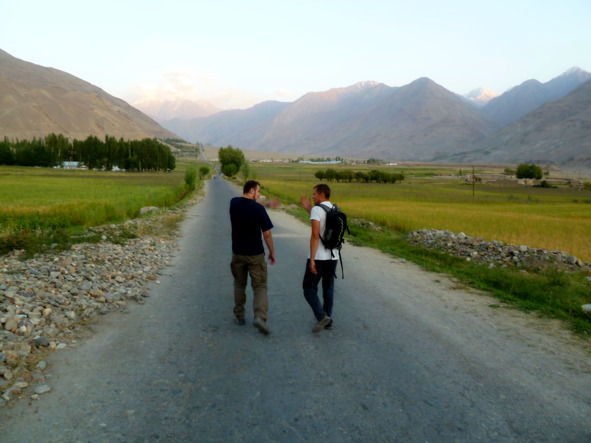 В Хороге, коротая время ожидания перед консульством, мы расположились по двум сторонам дороги на бетонных плитах и перекрикивались друг с другом на потеху прохожим.