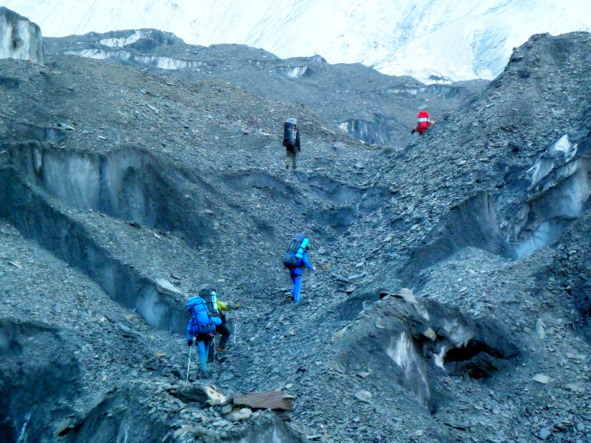 На следующий день Валера, Ренат и я отправились потренироваться в ледовом лазании по леднику. Это действие имело своей целью, улучшить нашу высотную акклиматизацию, и отработать экстренный подход к группе восхождения, на случай несчастья. В общем, кувыркались мы часа четыре, и к ужину вернулись в базовый лагерь. После набора и спуска спалось очень спокойно. Воздуха хватало, никто не задыхался. Однако лица у всех были, как после недельного запоя.