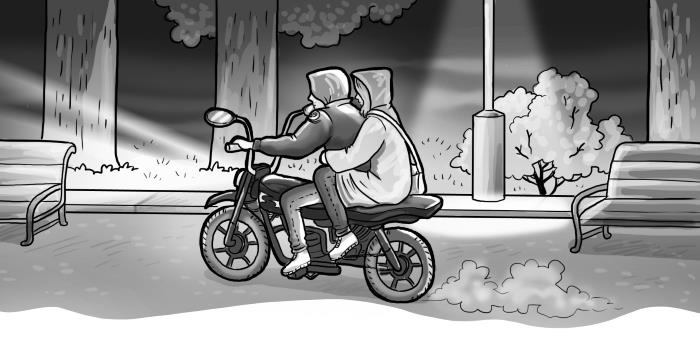 Тёмной летней ночью, когда краски становились гуще, а где-то поблизости гремел раскатистый гром, чёрный мопед с двумя пассажирами ехал по парку. Тишину нарушал треск мотора и шум потёртых шин. Управлял мопедом парень в чёрной куртке, а за его спиной сидела девушка в ярко-жёлтом дождевике.