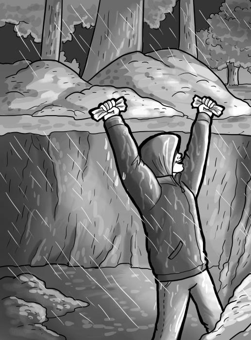 За это время он уже промок до нитки и земля превратилась в потоки грязи, которая, казалось, заполняла всё вокруг. Девушка накинула на голову капюшон дождевика, но он слабо помогал, крупные капли стекали по лицу.