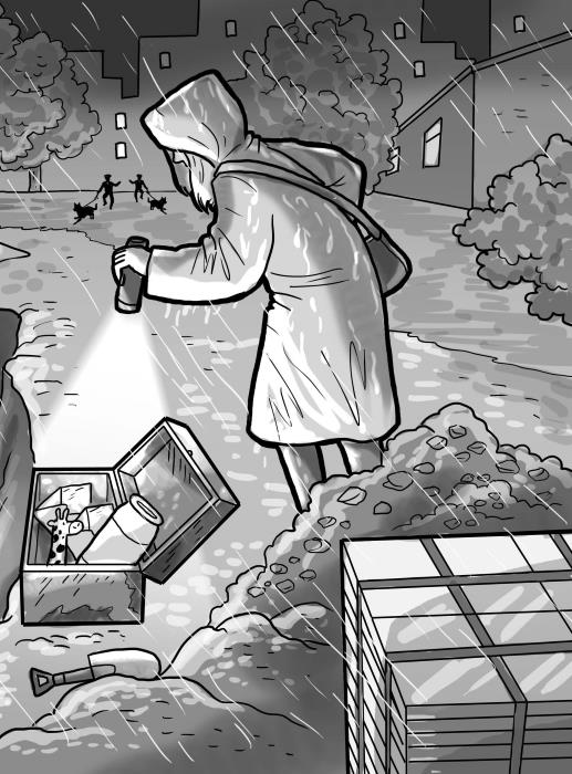 Парочка прошла вглубь парка и остановилась возле ямы размером в несколько метров в длину и ширину. Слабый луч фонарика выхватил из темноты новенькую бронзовую табличку: «Капсула времени. Вскрыть в 2123 году».