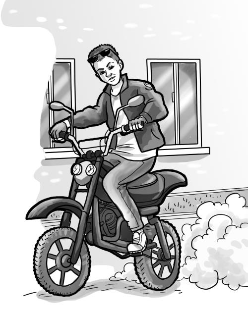 Парень судорожно выжимал сцепление, дёргая ручку, но мопед только чихал и оставался на месте.