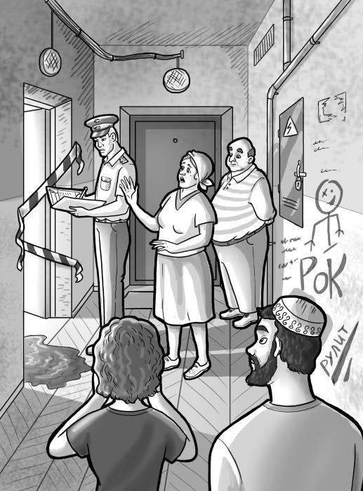 На лестничной площадке Коля был не один. Вместе с ним увидела лужу крови и Майя Смирнова. Бывшая оперная певица оказалась в отличной вокальной форме. От увиденного она побледнела, вскинула руки и закричала во всё своё музыкальное горло. Коля вздрогнул. Это был ультра-громкий звук, который оповестил абсолютно весь подъезд о случившейся беде.