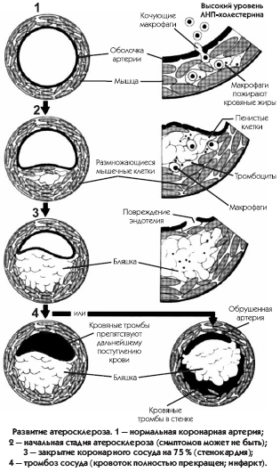 Постепенно размер бляшек увеличивается, все больше сужая просвет сосуда. Происходит это медленно и незаметно для больного. Даже при закрытии просвета сосуда более чем на 50 % человек может ничего не замечать и чувствовать себя полностью здоровым. При закрытии просвета на 75 %, как правило, появляются симптомы кислородного голодания. В этой книге они описаны в главе про стенокардию.