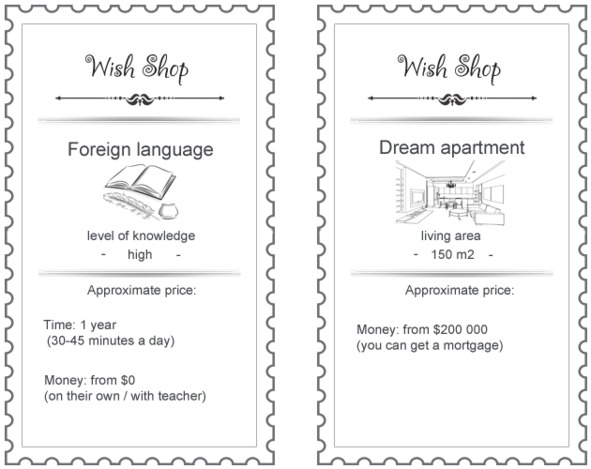 As you may have already realized, there are some desires that require only money. These are, as a rule, the purchase of household appliances, real estate, vehicles, and any material goods that make our life more comfortable and pleasant. Let’s put them in the first category of complexity. We will assign the second category of complexity to desires that require not only money but also time. To the third category we will refer complex desires, those for the realization of which, in addition to money and time, we need additional conditions.