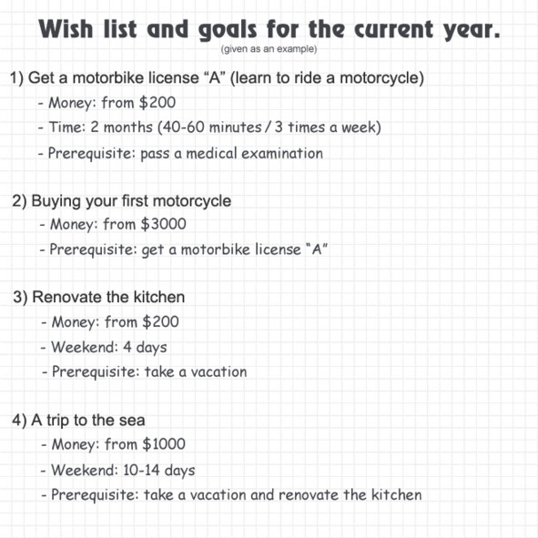 Now let’s do a very useful thing. Try to write down 3—4 wishes or goals that are important to you on a piece of paper. Exactly those that you want to realize during the year. These can be not only some big purchases, but also significant personal achievements for you.