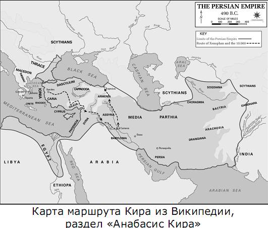 «Отсюда Кир проходит по пустыне Аравии, имея Евфрат по правую руку, в пять переходов 35 парасангов. В этом месте земля представляет собой равнину, плоскую, как море, и заросшую полынью» (35/5). Новый отсчет от перехода Евфрата. Этот фрагмент, сразу же ставит крест на трактовке похода Кира в традиционной версии истории. Комментаторы, конечно, исправляют автора: «Ксенофонт неправильно называет Аравией область от реки Аракса до границы Вавилонии. Аравия – область между Сирией и Месопотамией». Как всегда, когда у историков концы с концами не сходятся, они обвиняют древних авторов в неправильном освещении событий. Но автор, видимо предвидя, что его текст может быть искажен потомками, на следующей странице снова повторяет свою трактовку: «Проходя по этой области, они прибыли к реке Маску, шириной в плетр. Здесь был большой, но безлюдный город, по имени Корсота, обтекаемый рекой Маском. Там они пробыли 3 дня и пополнили свои запасы. Оттуда Кир проходит по пустыне, имея Евфрат с правой стороны, в тринадцать переходов 90 парасангов и прибывает в Пилы». (125/18). И дело не только в названии Аравия, дело в том, что он идет по пустыне. И следующее предложение в тексте это подтверждает: «На этих переходах от голода погибло много вьючного скота, ибо там не было травы, совершенно отсутствовали деревья, и вся местность была голая». А в традиционной версии истории Кир идет между Евфратом и Тигром на юго-восток, но там никакой пустыни нет. Поэтому, если речь идет о Евфрате, который мы знаем по традиционной трактовке древней истории, то маршрут должен идти на северо-запад. Традиционная трактовка этих событий моментально рассыпается. «Однажды, когда показался узкий проход и болото, трудно проходимые для повозок, Кир с окружавшими его самыми знатными и богатыми персами остановился и приказал Глусу и Пигрету взять отряд из варварского войска и протащить повозки…». Комментарий: «Между центральной частью пустыни и Евфратом встречаются местами огромные, покрытые жидкой грязью, пространства – результат испарения осадков, падающих здесь в период дождей, между ноябрем и апрелем». Комментаторы забывают о своем предыдущем комментарии, где Кир идет между Тигром и Евфратом, и рассказывают о местах покрытых грязью в пустыне.