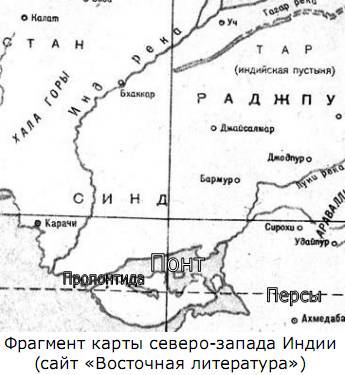 На этой карте показана одна из возможных версий нахождения Понта на северо-западе Индии. Будем считать, что Понт ― это залив (Качский залив), который присутствует внизу карты. Сегодня этого залива уже нет, чтобы убедиться в этом, достаточно посмотреть на современную карту северо-запада Индостана. Этот как раз тот объект, который, как и предвидели древние авторы, должен был исчезнуть, по этому признаку он нам подходит. Меотида должна находиться севернее, скорее всего какая-то река, впадавшая в этот залив, которая при разливах образовывало большое болото. Это болото тянулось до гор (см. цитату Аристотеля). Фасис, река, впадающая в Понт, будем считать, что это река Луни. В таком случае, на приведенной выше карте присутствует Понт, а Меотиды нет. Сама карта, взята с сайта «Восточная литература», [81] и очевидно, что эта карта ― реставрация, в ее основе карты 18-19 веков, которые можно найти в Интернете. Вполне возможно, что Меотиды, как и предвидели Полибий и Аристотель к моменту создания этих карт, уже не существовало. Как выглядел интересующий нас залив в древности, остается только догадываться.