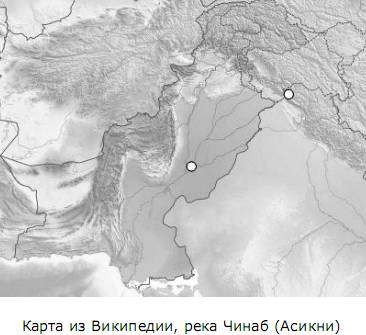 На этой карте кружками обозначены исток и устье реки Чинаб, она же Асикни, она же Акесин. В Википедии про эту реку написано: «Чинаб… как одна из рек Семиречья, упоминается в Ведах. Она является одной из рек «ведийского Пятиречья»… Средний расход воды у подножий Гималаев ― 890 м3/с. Летнее половодье. Воду реки орошают около 200 тысяч га…».