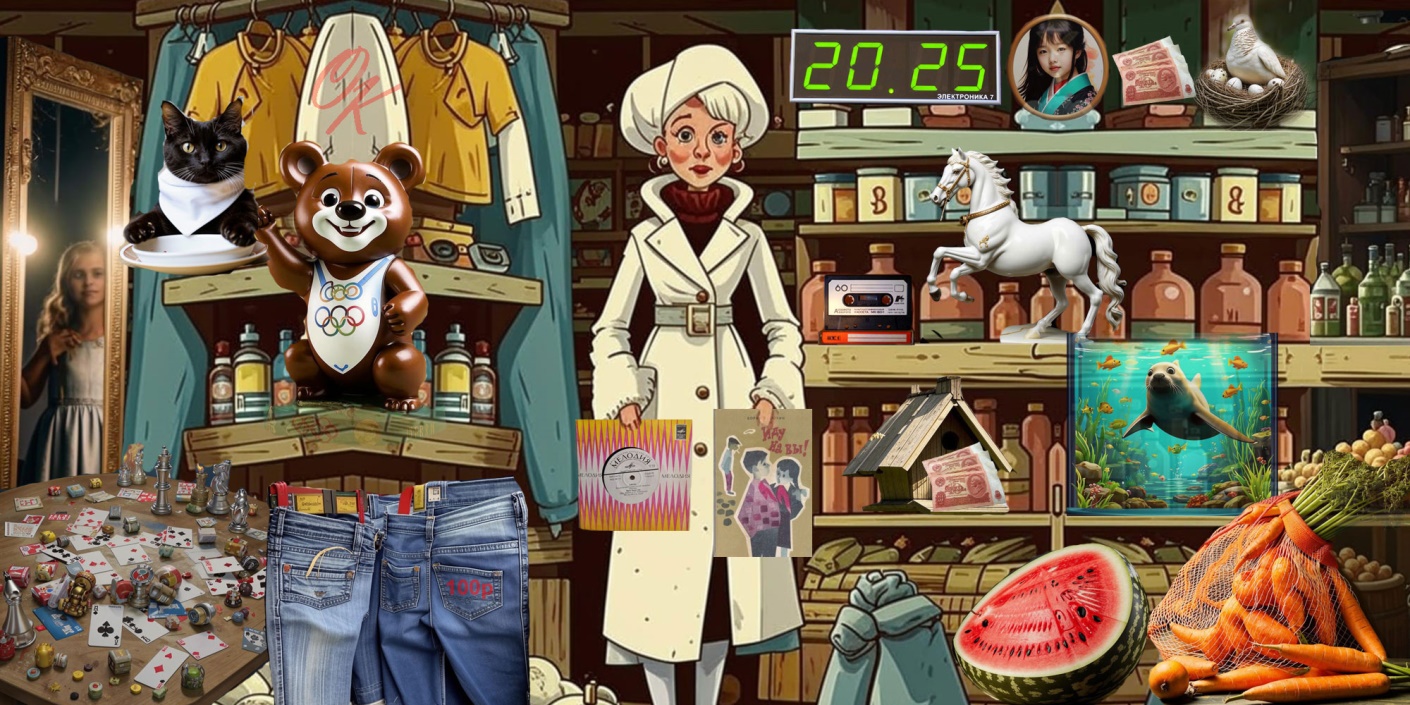 Дефицитные женские кофточки и красивые зеркала в полный рост. Разнообразные фрукты и овощи в упаковках и на развес. Аквариум с рыбками и маленькой нерпой. Загадочный черный котенок, который то ли был выставлен на продажу, то ли помогал торговать продавщице. В наличии были копеечные статуэтки олимпийского Мишки и коня на задних лапках, а также дорогущие индийские джинсы в ассортименте по сто рублей за штуку. Откуда у местных жителей такие огромные деньги, чтобы купить эти диковинные импортные штаны?