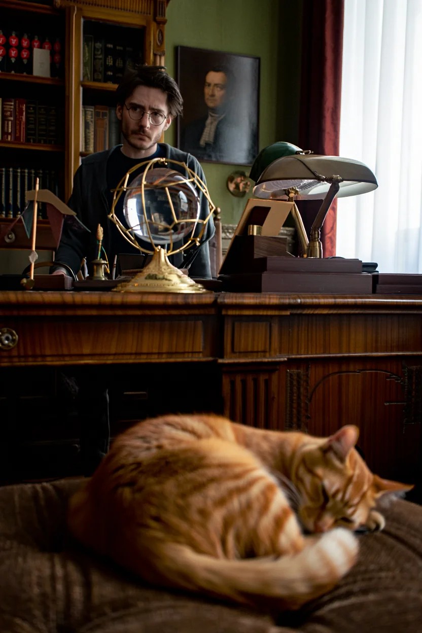 Барсик в эти дни вел себя подчеркнуто нормально: спал на пуфике, смотрел в окно на пролетающих голубей. Но Артем заметил новую деталь: кот стал чаще появляться рядом с ним. Не на коленях, не для ласки. Просто рядом. Когда Артем сидел за столом с тетрадью, Барсик укладывался на ковер у его ног. Когда Артем нервно ходил по кабинету, кот вставал и следил за ним взглядом, поворачивая голову. Молчаливое, немигающее наблюдение становилось почти физически ощутимым, навязчивым. Как будто золотые датчики сканировали каждую мысль, каждое движение пера по бумаге.