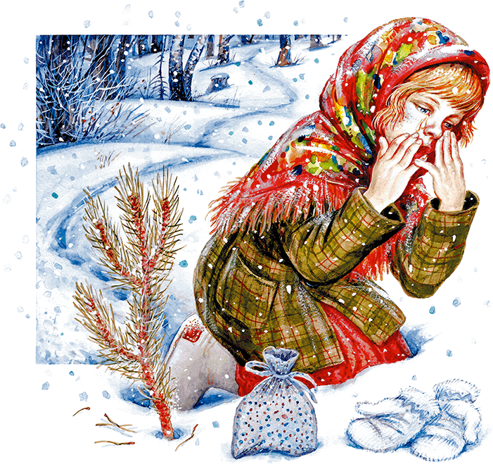 Варюша заплакала. Пропало колечко! Значит, не будет теперь здоровья деду Кузьме, и не будет у неё большущей радости, и не увидит она белый свет со всеми его чудесами. Варюша воткнула в снег, в том месте, где уронила колечко, старую еловую ветку и пошла домой. Она вытирала слёзы варежкой, но они всё равно набегали и замерзали, и от этого было колко и больно глазам.