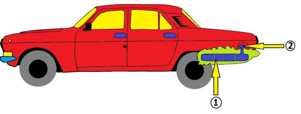 Рисунок №3. «1» -Топливный бак, который не видно снаружи автомобиля. Он установлен внутри кузова машины, а наружи выведена лишь горловина —«2» -через которую его можно наполнить топливом.
