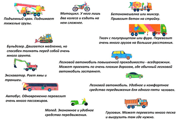 На свете очень много самых разных автомобилей. Обычно, на улицах города, мы видим легковые и грузовые автомобили, разные трактора и экскаваторы, подъемные краны и мотоциклы, большие цистерны и фуры – рисунок №1. Но в мире очень много и другой, самой разнообразной техники. Это может быть танк – военная машина, установка для забивания свай, погрузчик, каток, машина для откачки канализации, машина-холодильник, тягач для перевозки очень тяжелых грузов, техника для спиливания деревьев, траншеекопатель, комбайн для уборки хлеба и много-много другой, самой разнообразной техники. Каждая из них делает свою работу и создана специально для нее. Кстати, словом машина называют не только грузовик или легковой автомобиль.