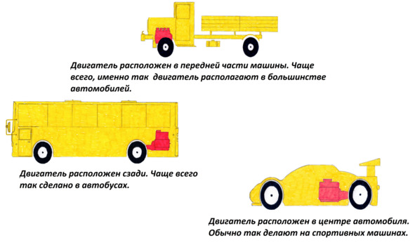 В этой книге мы узнаем, почему машина может ехать, что двигает ее вперед или назад. Автомобиль движется благодаря тому, что вращаются колеса. Колесо крутиться, отталкивается от дороги и толкает машину вперед или назад. А приводит колеса в движение – двигатель, он есть в любом автомобиле, и чаще всего находиться в передней части машины. Но иногда его располагают посередине или в задней части автомобиля – рисунок №2. Двигатель это самый сложный механизм в машине и самый важный – это его сердце. Именно он, двигатель, приводит в движение автомобиль, вырабатывает тепло, чтобы зимой в машине было не холодно, дает энергию для кондиционера так необходимого в жаркое время года. Вращает генератор дающий электроэнергию для разных систем автомобиля, например мультимедийной системы, чтобы слушать музыку и смотреть мультики. Для подогрева сидений и стекол, для работы фар. Двигатель очень сложное устройство и изучать, как он устроен в этой книге еще рано.
