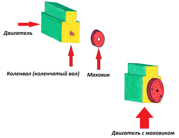 Рисунок №3 Внутри двигателя есть вал, который крутиться при его работе. Маховик крепиться к этому валу и уже маховик передает вращение колесам. На рисунках, двигатель изображен схематично. На самом деле, конечно он выглядит иначе.