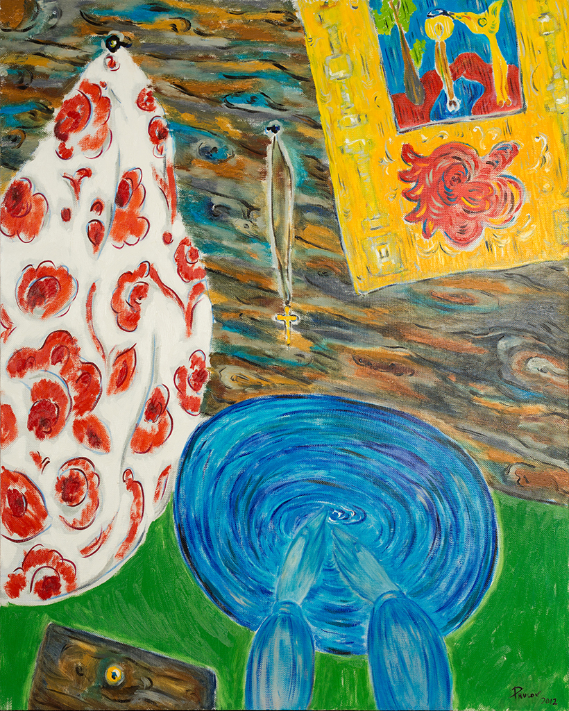 Я долго не мог придумать композицию на эту тему, но помог бытовой случай. В раковине я наблюдал, как утекает вода. Тогда ещё носил крестик, который снимал перед тем, как умыть лицо. И в этот момент сверкнула идея композиции. Раковина превратилась во Вселенную, зеркало обрело черты из далекого прошлого, простое белое полотенце засияло узорами, керамическая плитка исчезла – фактура дерева победила бездушный хай-тек.