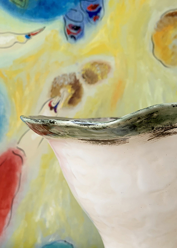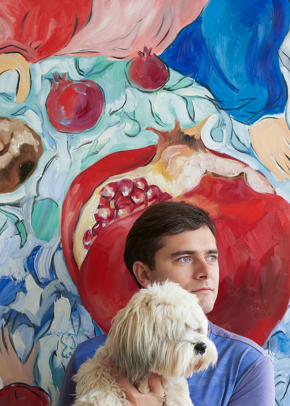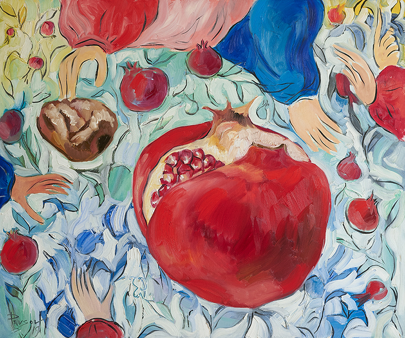 Белый холст стоит напротив кровати – он уже знает, что будет изображено на нём. Пишу, а мысли улетают во Вселенную. Гранаты, как планеты, особым образом взаимодействуют на безграничной плоскости холста. Орнамент выстраивает связь между всеми элементами, погружая нас в жёлтые, изумрудные, красные и синие оттенки. Остался только один вопрос – какова моя роль в этом действии.