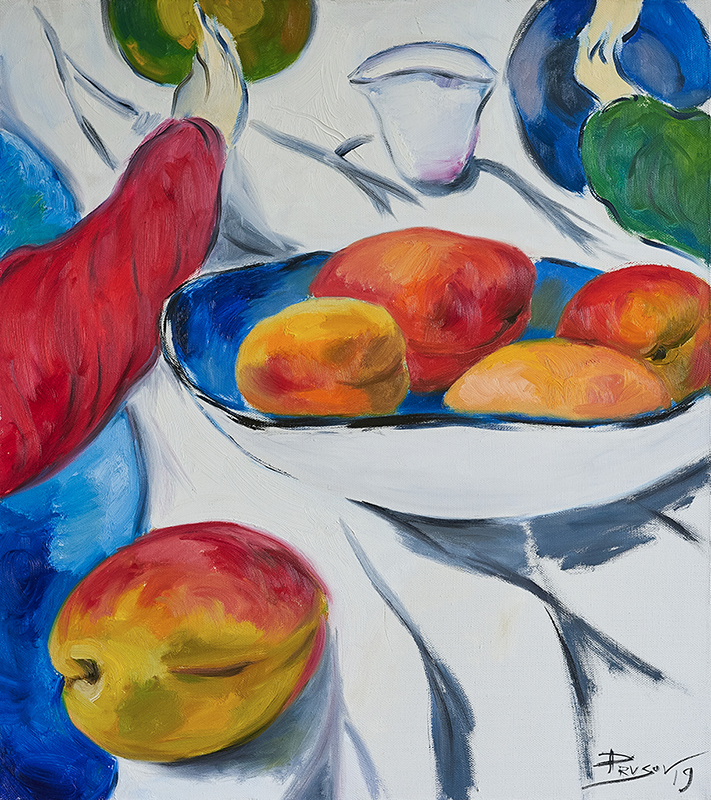 Эх, не могу не написать эту красоту масляными красками – в очередной раз нарушаю трапезу просьбой ничего не есть. Да, нужен именно этот вид, эта композиция. Гости привыкли к моим причудам. «Сегодня хоть есть вино и сыр, – высказались друзья, – можно обойтись и без персиков».