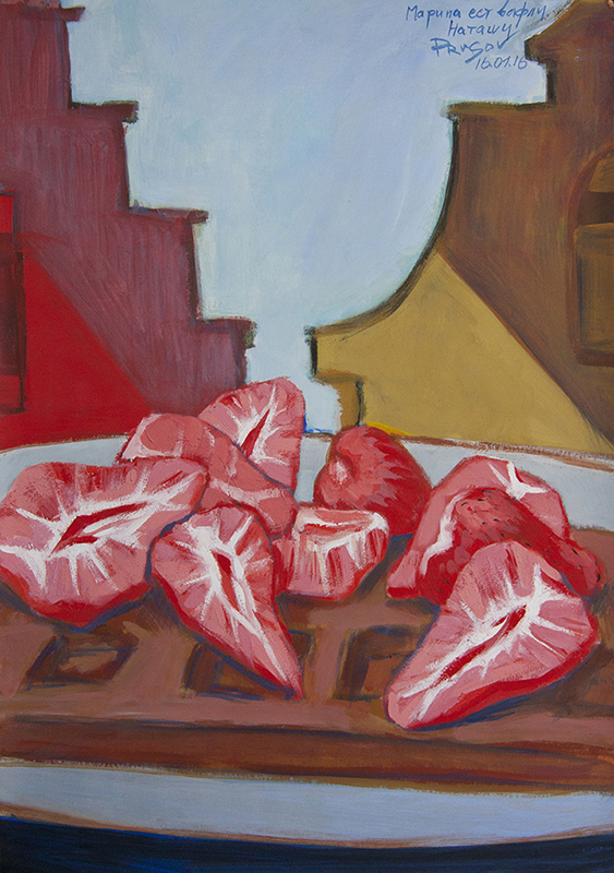 К сожалению, кафе закрылось несколько минут назад, и мы не успели вновь порадоваться сочной клубнике на хрустящей вафле. «Посмотрим на твою картину и успокоимся, – пошутили друзья, – а что ещё нам оставалось делать?».