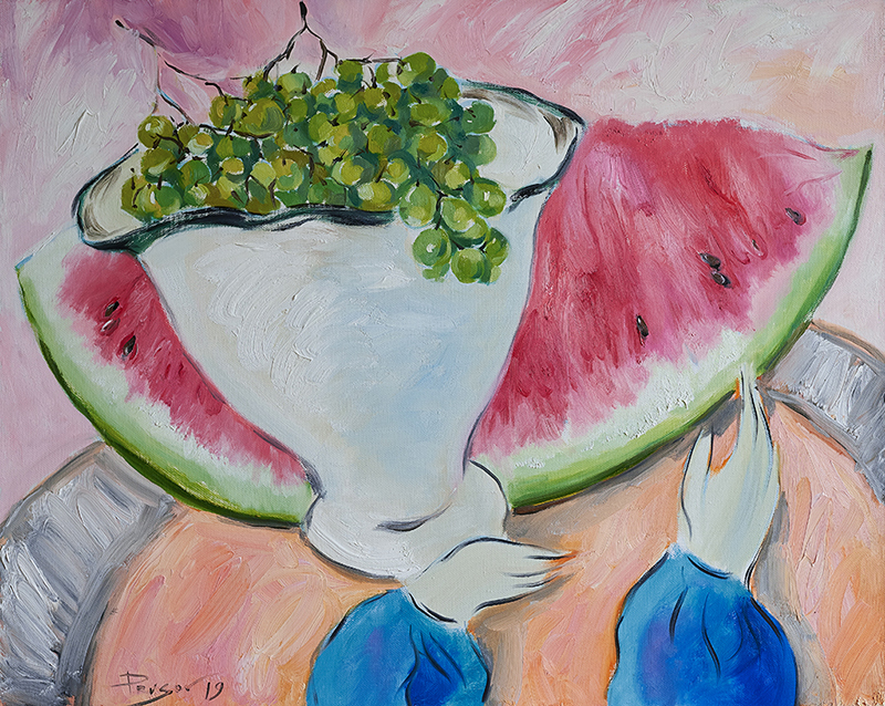 Watermelon and grapes in a vase. 2019. Canvas, oil. 80x100 cm