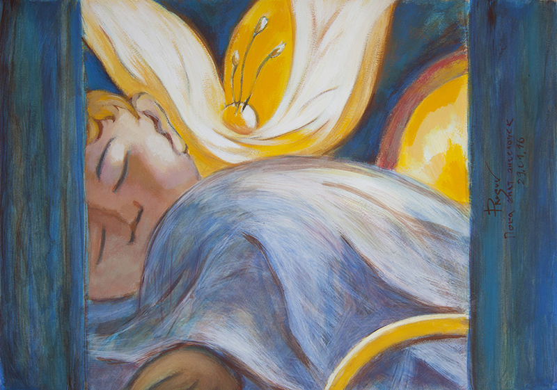 A yellow lily protects the little boy. By its tendrils it watches the silence and with its petals – covers from a bright light. I want to infinitely observe this scene inspired by God.