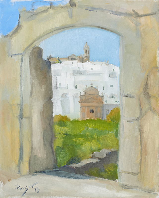 Finally I reached Ostuni – a white pearl of the southern part of Italy. I live in a typical for this town house with the stone arches. I feel myself like a child in a small castle. I'm full of energy. I am going to find a necessary view taking with me all the materials for painting. And finally, when I went far away from crowded place and jumped over a high hence (perhaps I reminded an insane person), in the shadow of ruined street I found an arch with the fabulous view from it. The heat doesn't confuse me. Even if I'm sunburned I will still paint this scene!