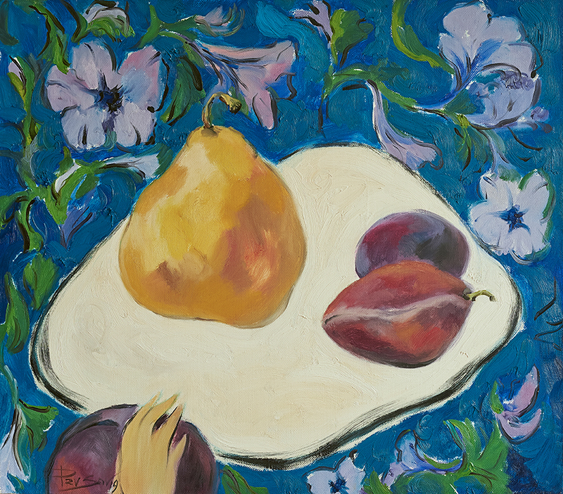 A pear and plums against petunias. 2019. Canvas, oil. 70x80 cm