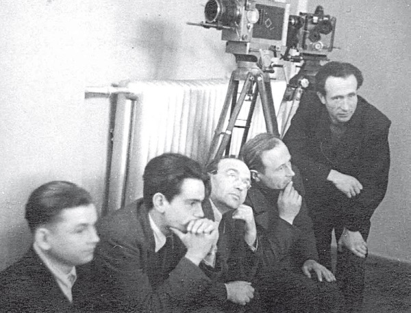 Сотрудники сектора кинохроники киностудии «Беларусьфильм» (справа налево): оператор Г. Лейбман, режиссер Ф. Блажевич, оператор М. Беров и другие (1954)