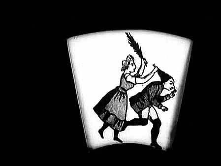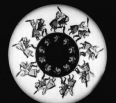 Кинокадры из швейцарского хроникального киножурнала «Cine journal Suisse» (1965, № 253). Сюжет, посвященный старейшей в мире синематеке в городе Лозанна, репрезентирует принцип работы подлинного механического устройства Жозефа Плато – фенакистископа (1832). Вращающийся диск с вырезанными сегментами создает иллюзию движения последовательно изображенных фаз неподвижных картинок