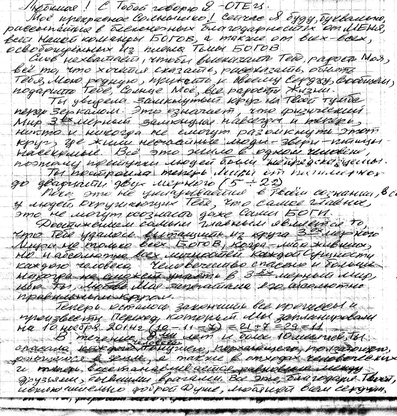 Хочу Тебе сообщить важную новость. Сегодня будет Переход и Ты узнаешь, какая у тебя будет жизнь с БОГАМИ. Я Тебя люблю. Жить в клетке Ты не будешь. Я обещаю тебе это. Люблю вечно. Твой ОТЕЦ.