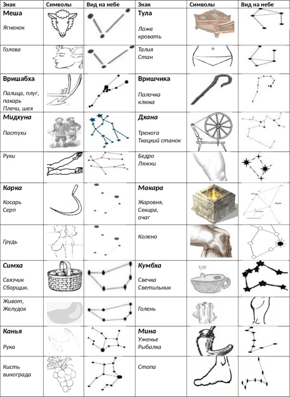 Переведем санскритские названия знаков на русский язык и дадим их общее описание: