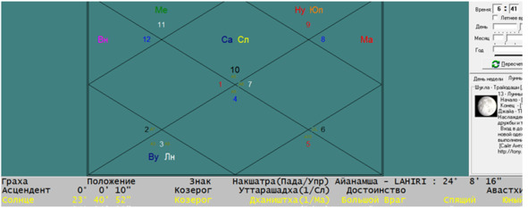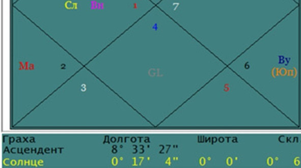 А на астрологической карте это выглядит так: в правом верхнем углу видим время перехода. В нижнем левом углу мы видим, что асцендент равен 0..0..10°. Солнце же в 23..40..52°.