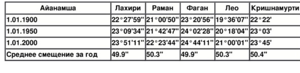 – Лахири,– Фаган-Брэдли,– Кришнамурти,– Ревати,– Вавилонские и много прочих.Они отличаются точкой и временем отсчета, скоростью смещения.