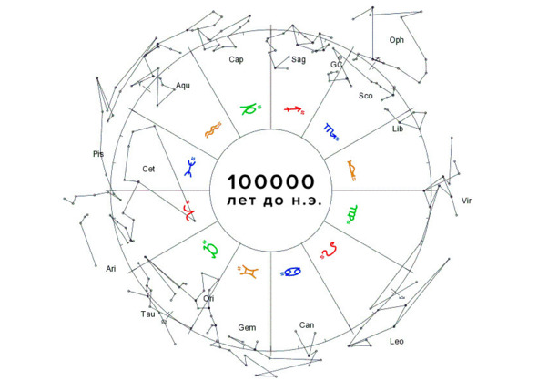 5000 лет назад созвездия имели немного другой вид для земного наблюдателя. Программисты попытались даже смоделировать то, как, возможно, выглядели созвездия зодиака 100 тысяч лет назад. Маловероятно, что было именно так, как изображено на рисунке, но это очень наглядно показывает влияние смещения земной оси на динамику изменения контуров созвездий.