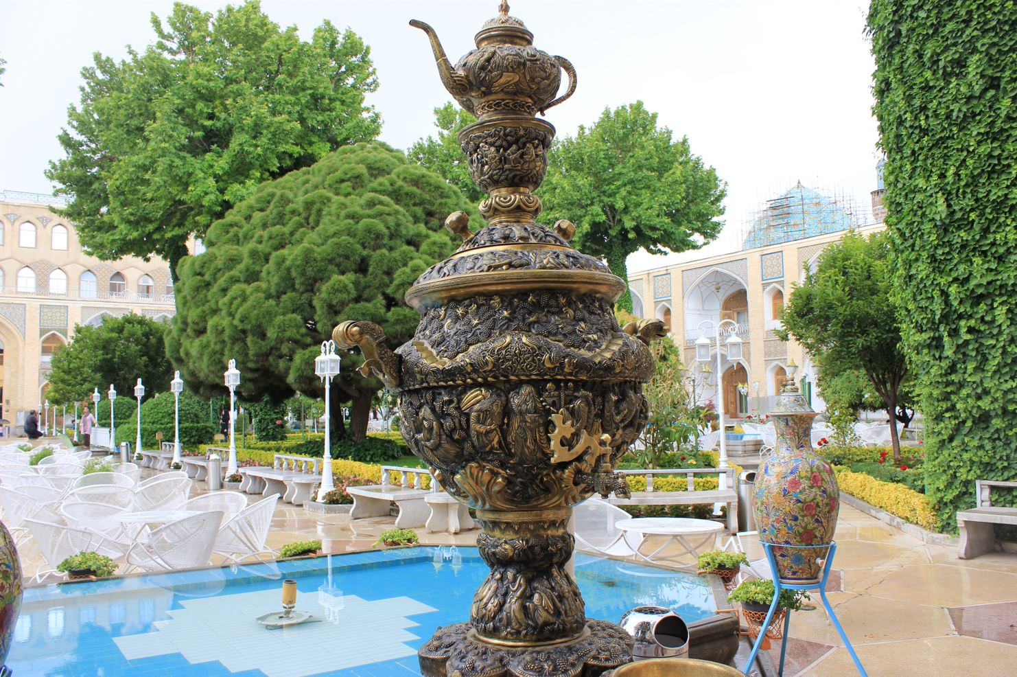 Не могу сейчас вспомнить для чего именно, но мне даже довелось покупать самовар в Иране. Я знал одну лавку, где продавались эти нехитрые предметы обихода. Она располагалась в одном из самых оживлённых мест базара и витриной выходила на площадь Накш-е Джахан. Как можно предположить, цены там нельзя было назвать низкими. Для большего привлечения клиентов на площади рядом с входом в магазинчик стоял огромный, больше человеческого роста пузатый самовар, очень искусно и красиво декорированный.