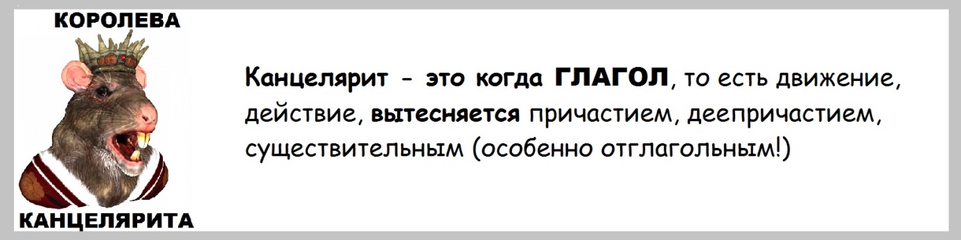 Канцелярит – это когда глагол, то есть движение, действие, вытесняется причастием, деепричастием, существительным (особенно отглагольным!).