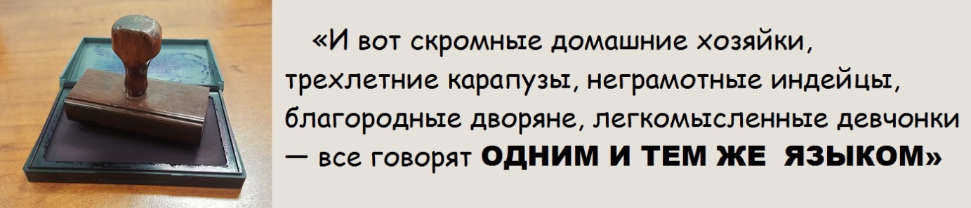 Штампы везде. Нора Галь пишет: «И вот скромные домашние хозяйки, трехлетние карапузы, неграмотные индейцы, дворяне, бюргеры, бедняки, бродяги, легкомысленные девчонки – все без разбору, во все века и эпохи, при любом повороте судьбы – в горе, радости и гневе, объясняясь в любви, сражаясь и умирая, говорят одним и тем же языком: