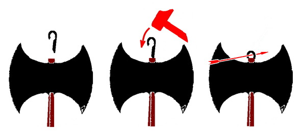 Достаточно вспомнить маленькую деталь. Чтобы топор держался на топорище, в верхушку последнего вбивают гвоздь – и загибают. Мы предположили, что древнегреческий оружейник – не глупее русского мужика. А также, что длинные рукояти боевых секир, как и древка копий, делались из легкого дерева, а не из тяжелого и, главное, дорогого металла. Соответственно, в верхушку каждой рукояти в обязательном порядке должен был вбиваться распорный гвоздь (или, скорее, клин) с загнутым верхом. Либо верх можно загнуть после этого – неважно. Важно, чтобы он был загнут по кольцу, тогда загиб не будет иметь слабых мест и не сломается при ударе. Поглядите-ка на рисунок 1: вот оно, таинственное отверстие!