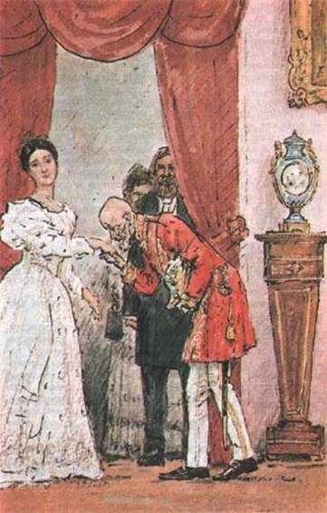 Действительно, из-за портьеры, в глубине залы, вышел, семеня тонкими ножками в белых штанах, маленький, сухонький, сморщенный старичок в красном, расшитом золотом, мундире, в красной ленте, звездах и орденах, с трехуголкой, украшенной белым плюмажем, в руке.