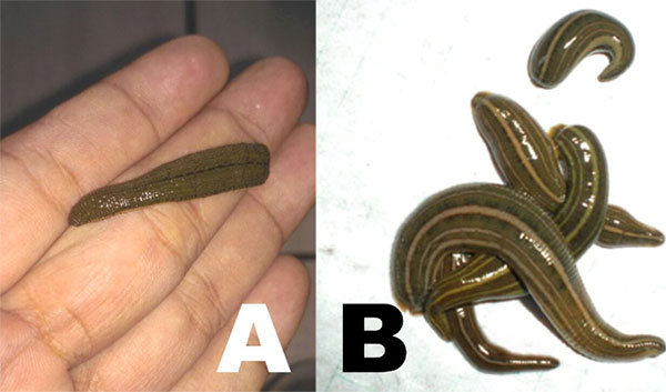 Рис. 2. Пиявка японская (Hirudo nipponia, Witman, 1886): A – фото от 14.09.2017; B – фото по материалам сайта http://bio113.weebly.com/hirudo-nipponia.html