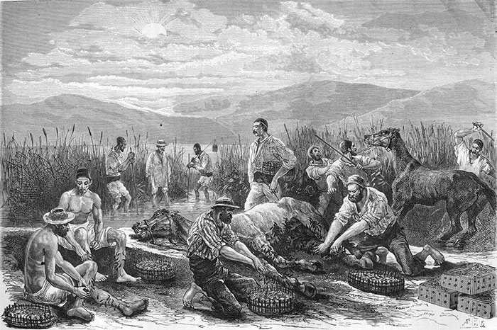 Рис. 5. Ловля медицинских пиявок на озере Copais, Греция. Литография H. Belle из журнала “Le tour du Moude”,1876 (Личный архив)