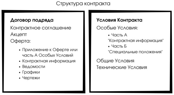 Такие контракты условно можно разбить на две составные части, которые, как правило, включают в себя договор подряда и Условия контракта, которые, в свою очередь, чаще всего содержат следующие документы: