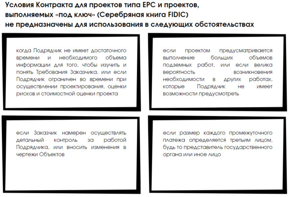 При этом Условия Контракта для проектов типа ЕРС и проектов, выполняемых «под ключ» (Серебряная книга FIDIC) не предназначены для использования в следующих обстоятельствах: