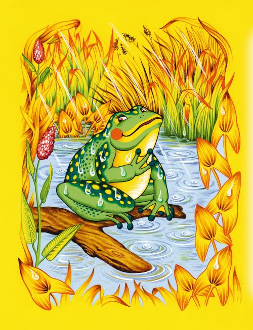 Дождик моросил по её пёстренькой лакированной спинке; капли его подтекали ей под брюшко и за лапки, и это было восхитительно приятно, так приятно, что она чуть-чуть не заквакала, но, к счастью, вспомнила, что была уже осень, и что осенью лягушки не квакают – на это есть весна, – и что, заквакав, она может уронить своё лягушачье достоинство. Поэтому она промолчала и продолжала нежиться.