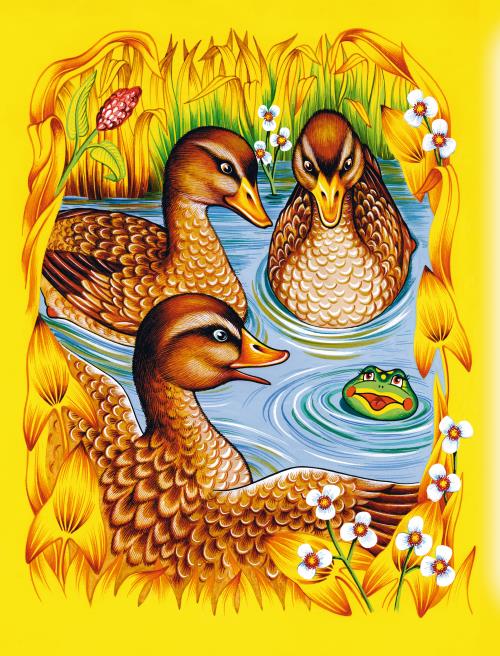 И утки окружили лягушку. Сначала у них явилось желание съесть её, но каждая из них подумала, что лягушка слишком велика и не пролезет в горло. Тогда все они начали кричать, хлопая крыльями: