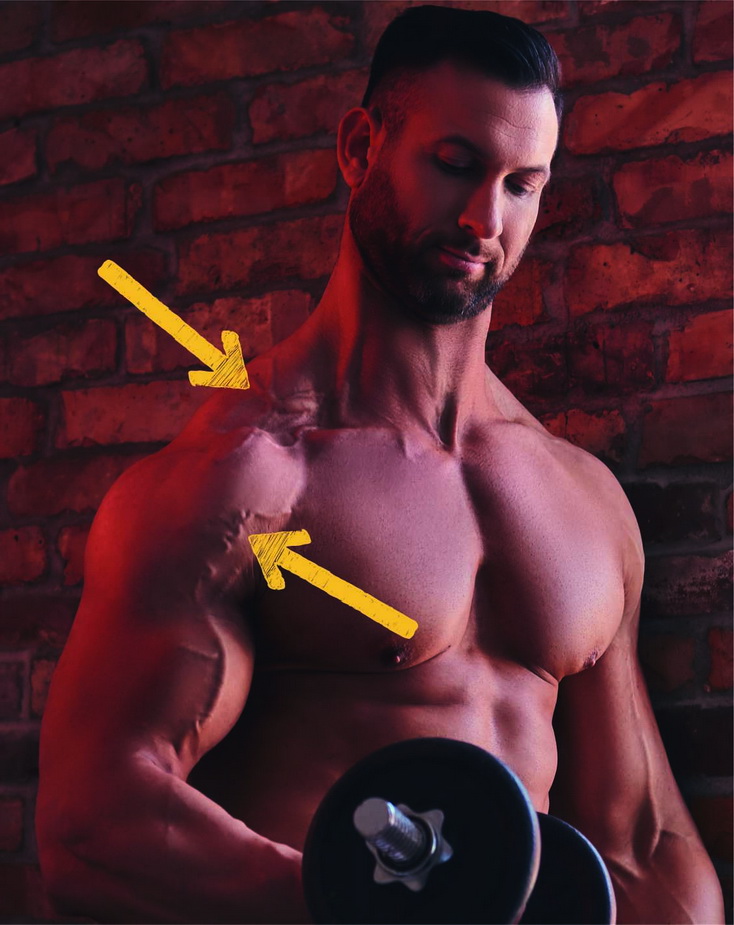 Рисунок 1. Варикозно расширенные вены (указаны жёлтой стрелкой) на плече у бодибилдера. Фото @fxquadro www.freepik.com
